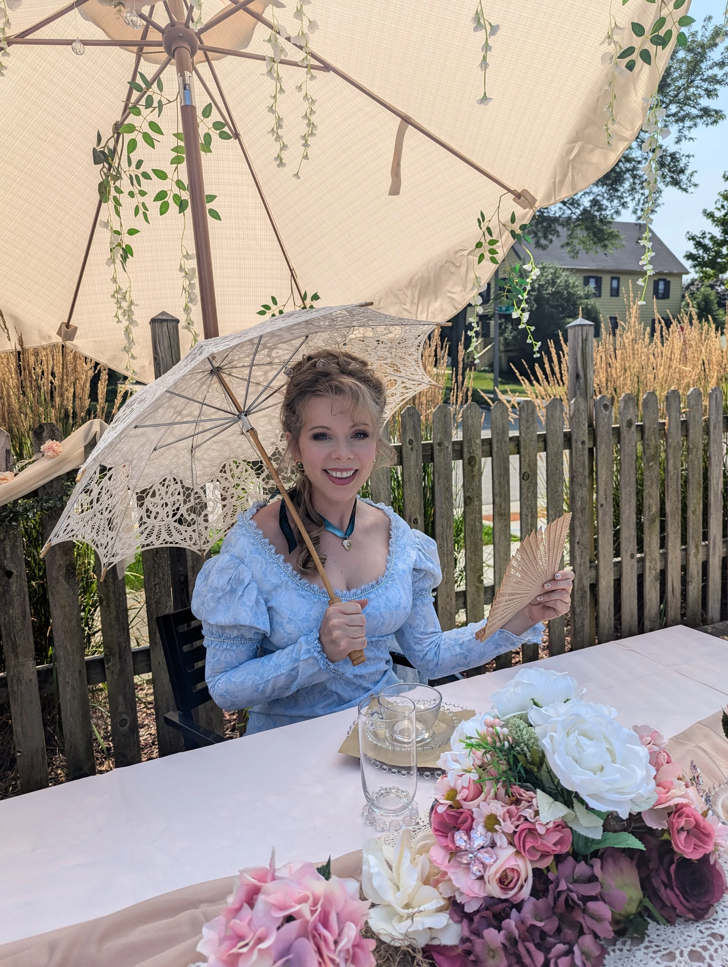 I have access to theater costumes and seamstresses to build a character upon request (with enough advanced notice). In addition to costuming, I am committed to stepping into the role by thoroughly researching the historical background or creating the backstory to the character for the most authentic interaction.